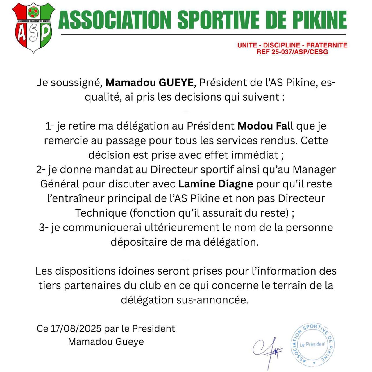 Dans un communiqué daté du 17 août 2025, le président de l’AS Pikine, Mamadou Gueye, a annoncé plusieurs décisions importantes pour la gouvernance du club.